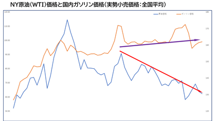 上は2021年1月からのNY原油(WTI)先物価格(中心限月)と国内のガソリン実勢価格(全国平均)の相関図です。